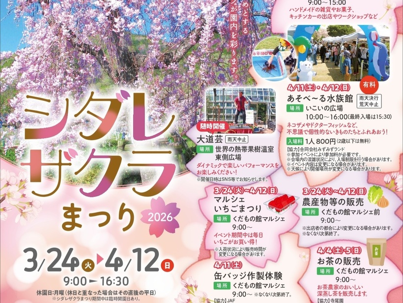 2026年04月12日(日) NEW 「フルーツフラワーリレー」「シダレザクラまつり」開催のお知らせ 「フルーツフラワーリレー(2/27~3/22)」、「シダレザクラまつり(3/24~4/12)」を開催します。 「シダレザクラまつり」期間中は駐車場が有料となりますのでご了承ください。 詳細は、季節のイベントページをご覧ください。