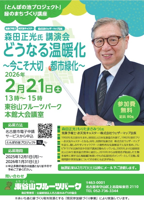 名古屋市出身の気象予報士・森田正光さんによる「どうなる温暖化 ~今こそ大切 都市緑化~」と題した講演会です。
